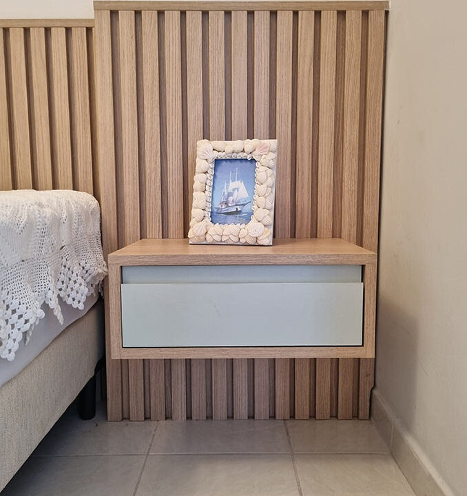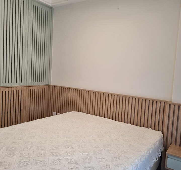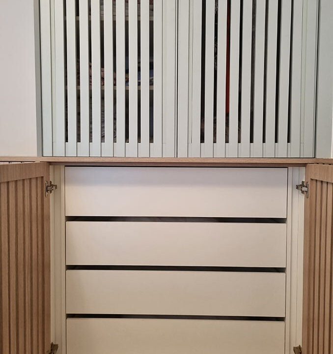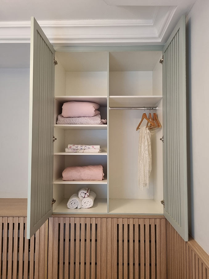 No quarto, o apartamento tem um problema crônico de infiltração na fachada que acabou estragaando todo o armário antigo. Por isso os clientes optaram por fazer o mínimo possível de armáios e criamos essa solução de 2 portas altas e 4 portas baixas, com cores diferentes. E as portas são feitas em painel ripado vazado para circulação de ar, evitando o excesso de mofo, já que é um apartamento de veraneio.