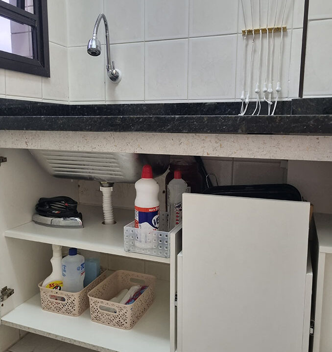 A lavanderia ganhou um gabinete para lixo, uma bancada nova de pedra (seguindo o mesmo padrão da cozinha) e um tanque metálico embutido.