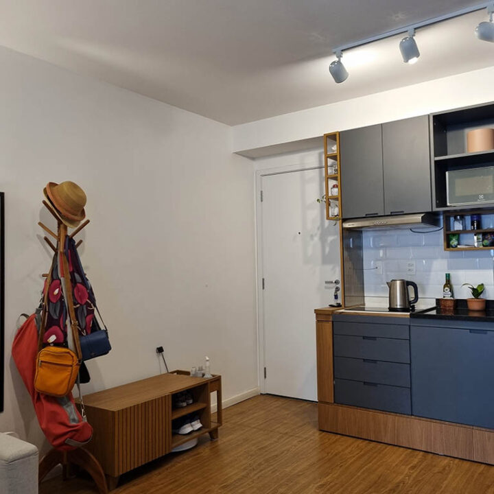 Projeto de interiores de um estudio no edifício Tetris em São Paulo. A cliente pediu uma boa cozinha com máquina da lavar roupas escondida e algo para fazer a divisão entre a sala e o quarto mas que não fosse uma parede.