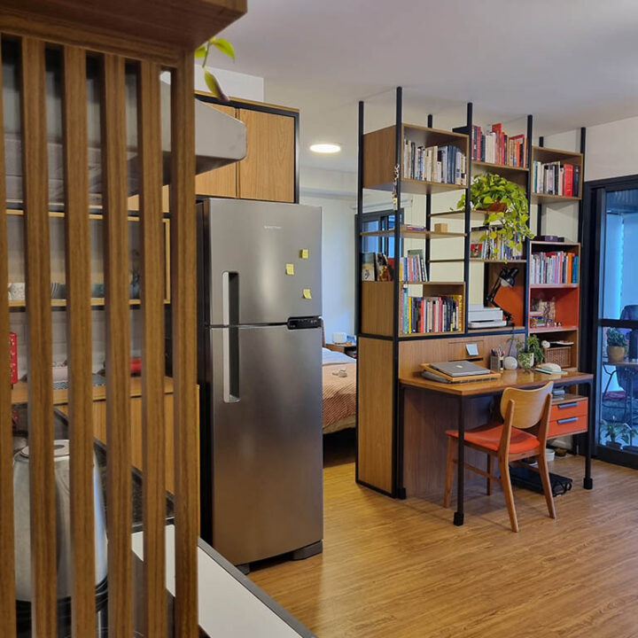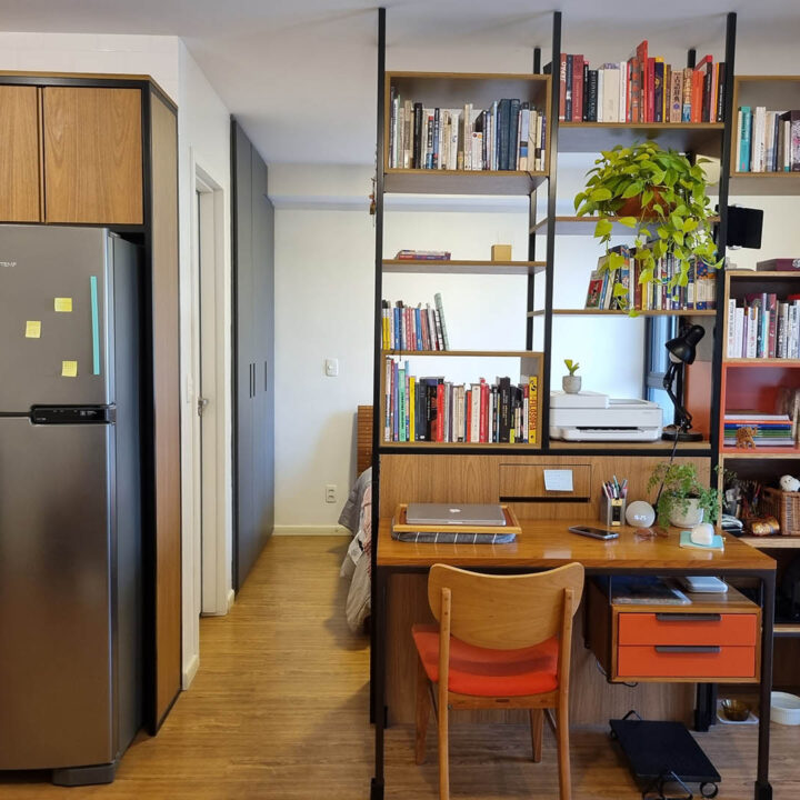 Nós então criamos uma estante vazada que na sua metade apoia, de um lado o home office da cliente e do outro o gaveteiro do quarto, e para cima, nichos para a cliente guardar seus livros e itens especiais.