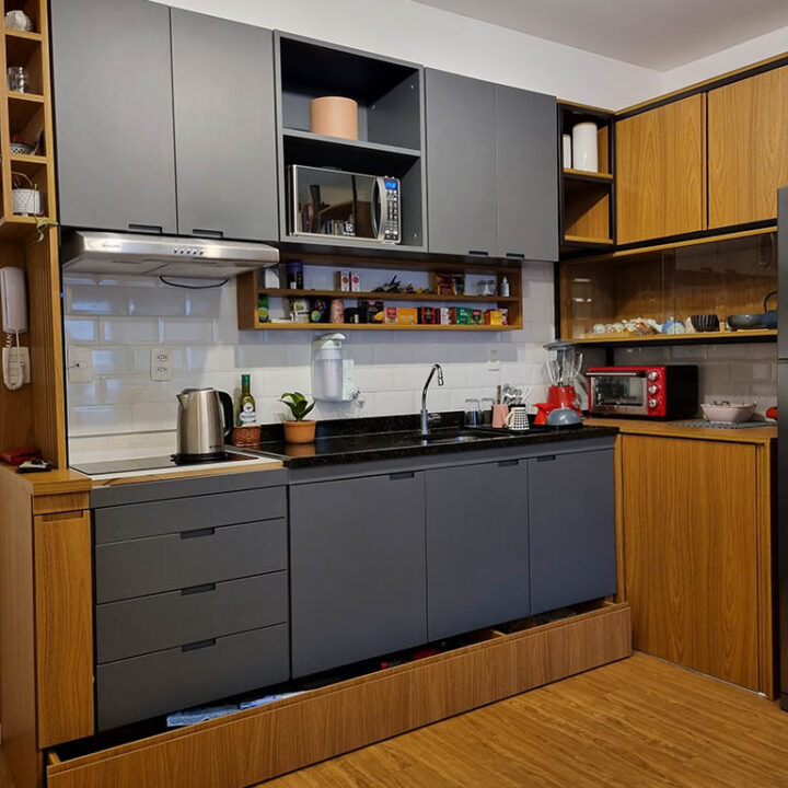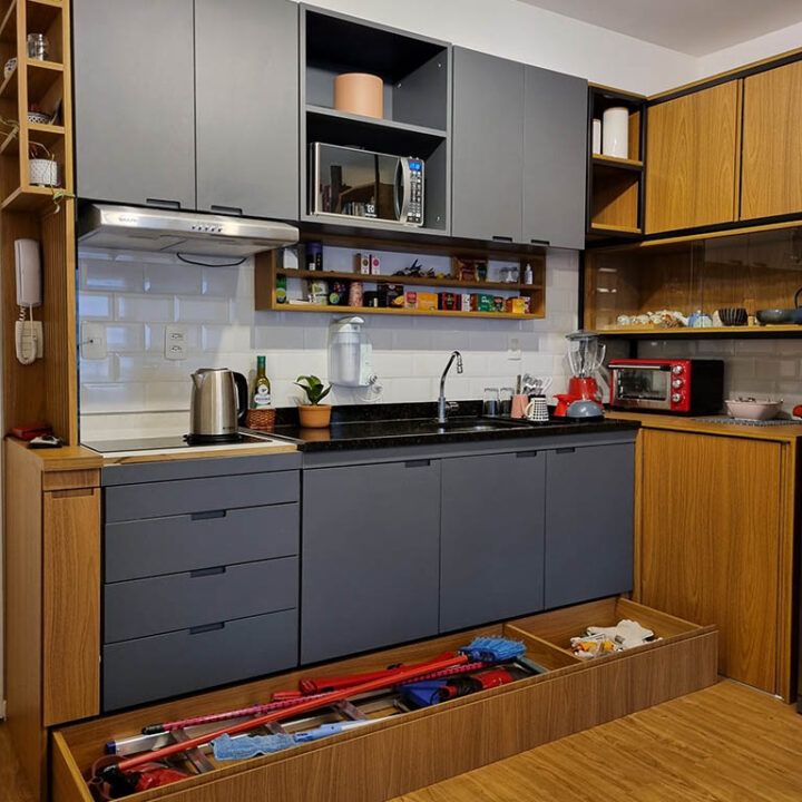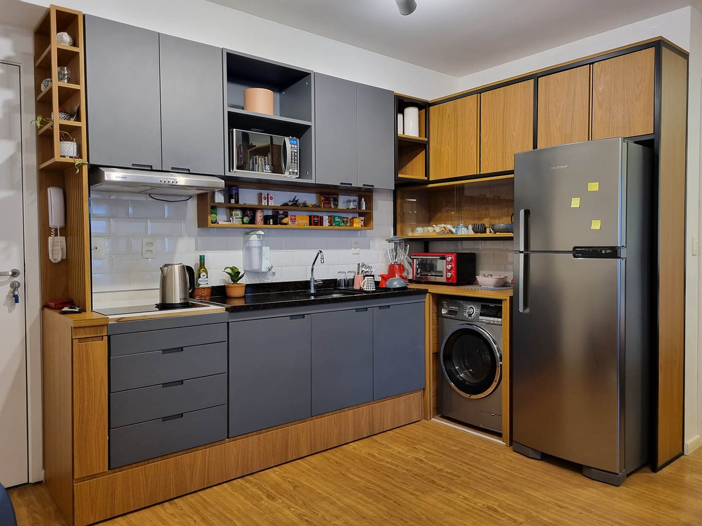 Na cozinha, aproveitamos cada centimetro. A máquina de lavar roupas ficou escondida por uma porta de correr e os itens de lavanderia ficaram num carrinho tipo gavetão embaixo do armário feito tudo sob medida.