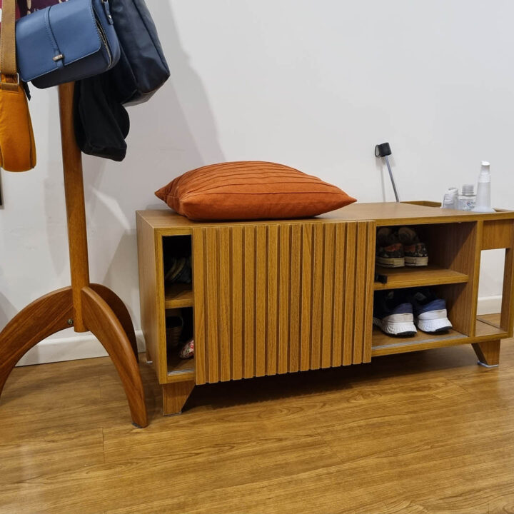 Para esse projetos nós criamos também, a sapateira Gaia, design exclusido da Bianca para a cliente, com banco e porta trecos.